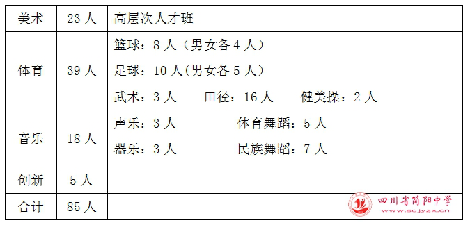 根據(jù)《簡(jiǎn)陽(yáng)市2018年高中階段學(xué)校招生工作意見》{簡(jiǎn)招委〔2018〕4號(hào)}文件精神,結(jié)合學(xué)校實(shí)際情況,經(jīng)學(xué)校研究,現(xiàn)將四川省簡(jiǎn)陽(yáng)中學(xué)2018年高一藝體及創(chuàng)新能力特長(zhǎng)生招生方案公告如下: